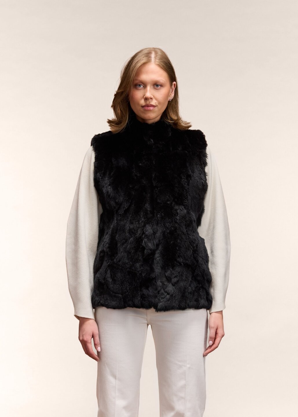 Gná vestið er klassískt vesti framleitt úr hágæða kanínuskinni. Skinnið er náttúrulega mjúkt sem gerir vestið fullkomið til daglegrar notkunar. Gná er frábær viðbót í fataskápinn þinn, þar sem það passar bæði fallega einfaldar gallabuxur og stuttermabol, auk þess sem hægt er að nota það yfir gallajakka eða leðurjakka. Hár kraginn er bæði fallegur og praktískur, vestið er því tilvalið fyrir kalda daga á skrifstofunni eða utan yfir vor-og haustjakkann.