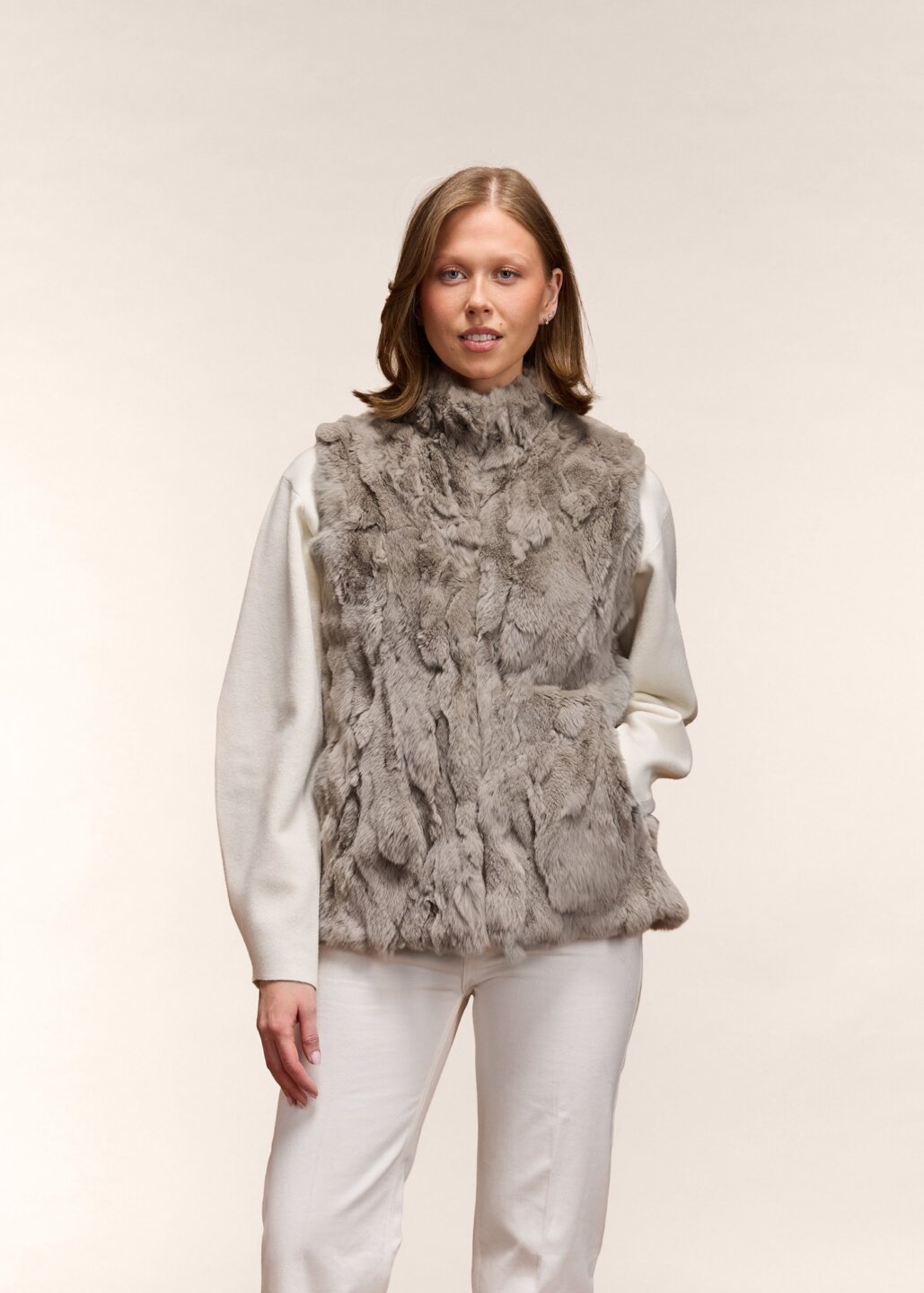 Gná vestið er klassískt vesti framleitt úr hágæða kanínuskinni. Skinnið er náttúrulega mjúkt sem gerir vestið fullkomið til daglegrar notkunar. Gná er frábær viðbót í fataskápinn þinn, þar sem það passar bæði fallega einfaldar gallabuxur og stuttermabol, auk þess sem hægt er að nota það yfir gallajakka eða leðurjakka. Hár kraginn er bæði fallegur og praktískur, vestið er því tilvalið fyrir kalda daga á skrifstofunni eða utan yfir vor-og haustjakkann.