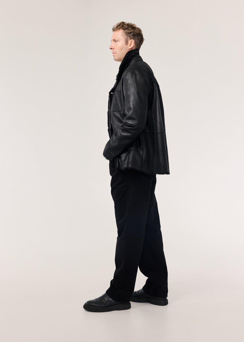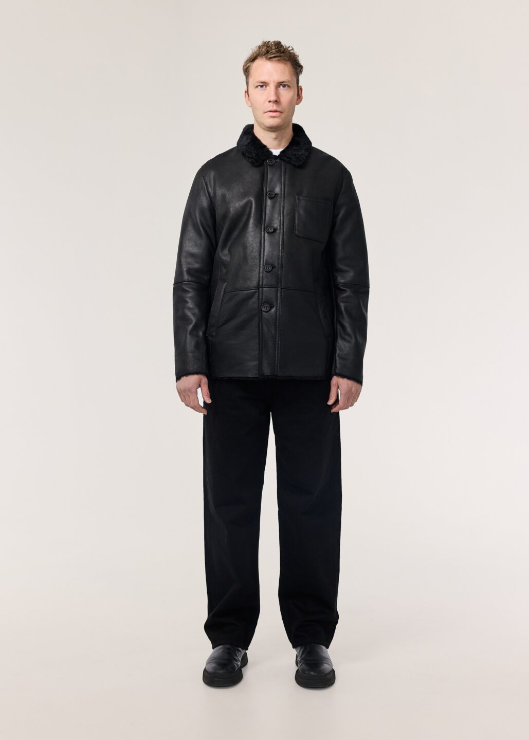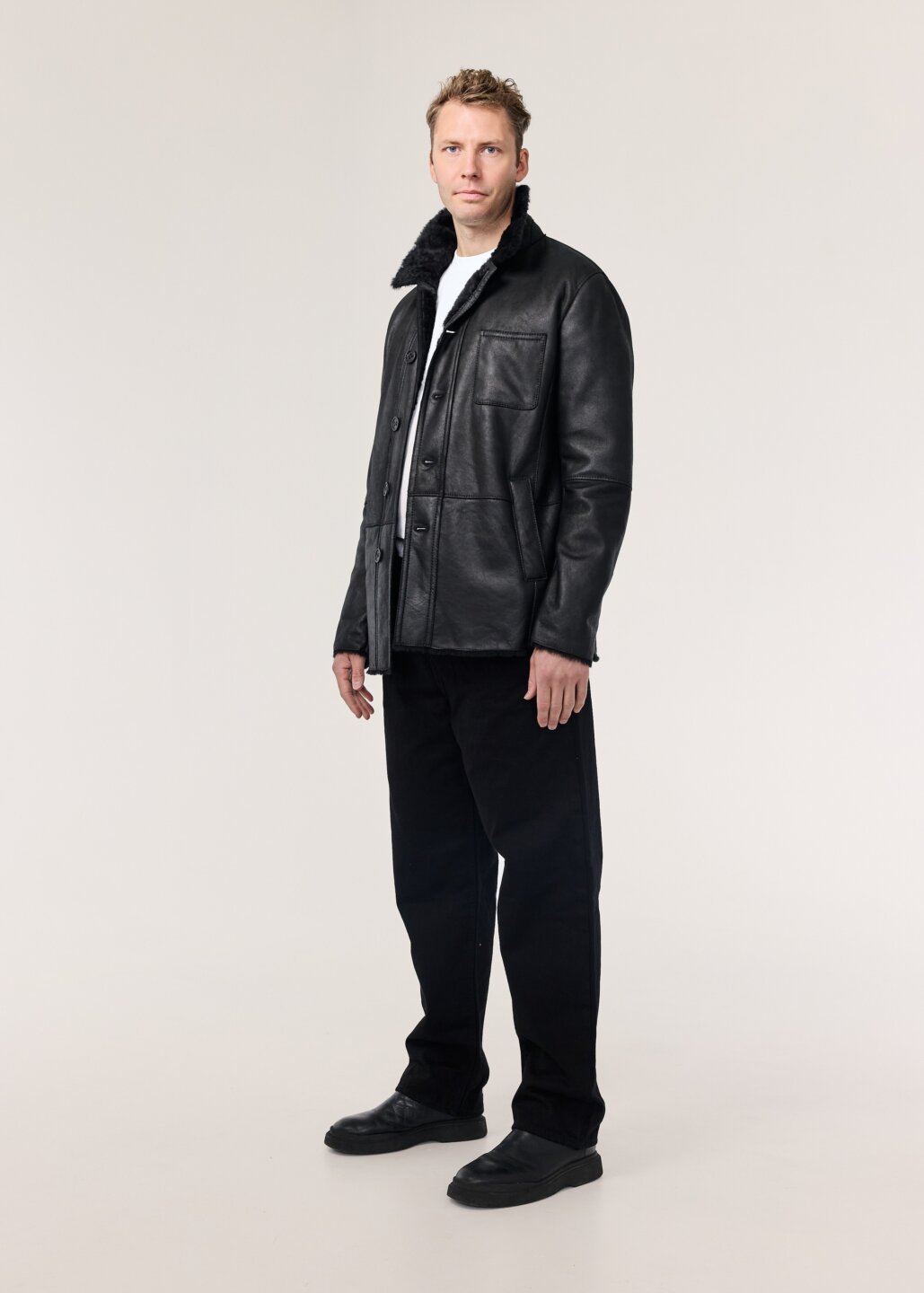 Logi er lipur og klassískur mokkajakki, framleiddur úr silkimjúku velúr lambaskinni. Jakkinn er ótrúlega léttur með hefðbundnu vinnujakka sniði. kraginn á jakkanum fellur fallega niður, en einnig er hægt að hneppa honum upp í háls á kaldari dögum. Jakkanum er hneppt með tölum framleiddum úr ekta horni, hann er prýddur þremur fallegum ytri vösum auk tveggja praktískra innri vasa. Þessi jakki er ómissandi í fataskápinn.