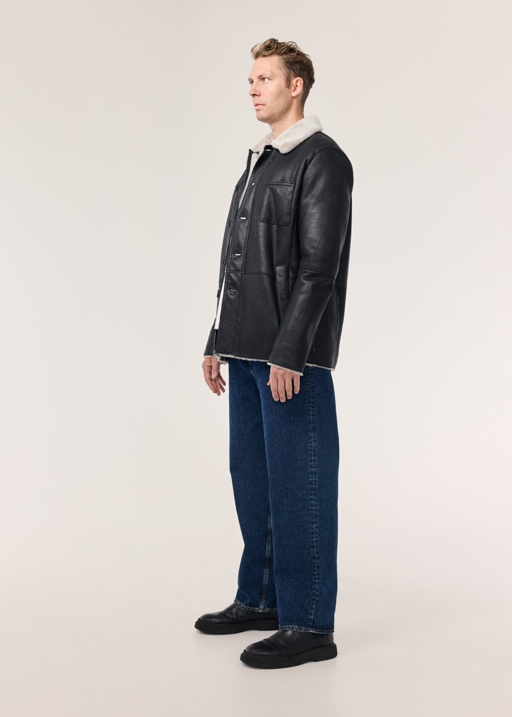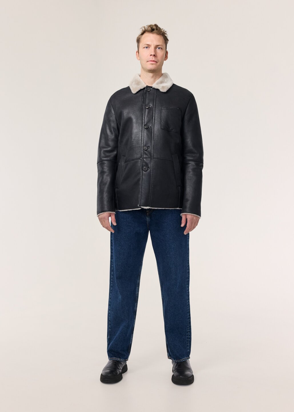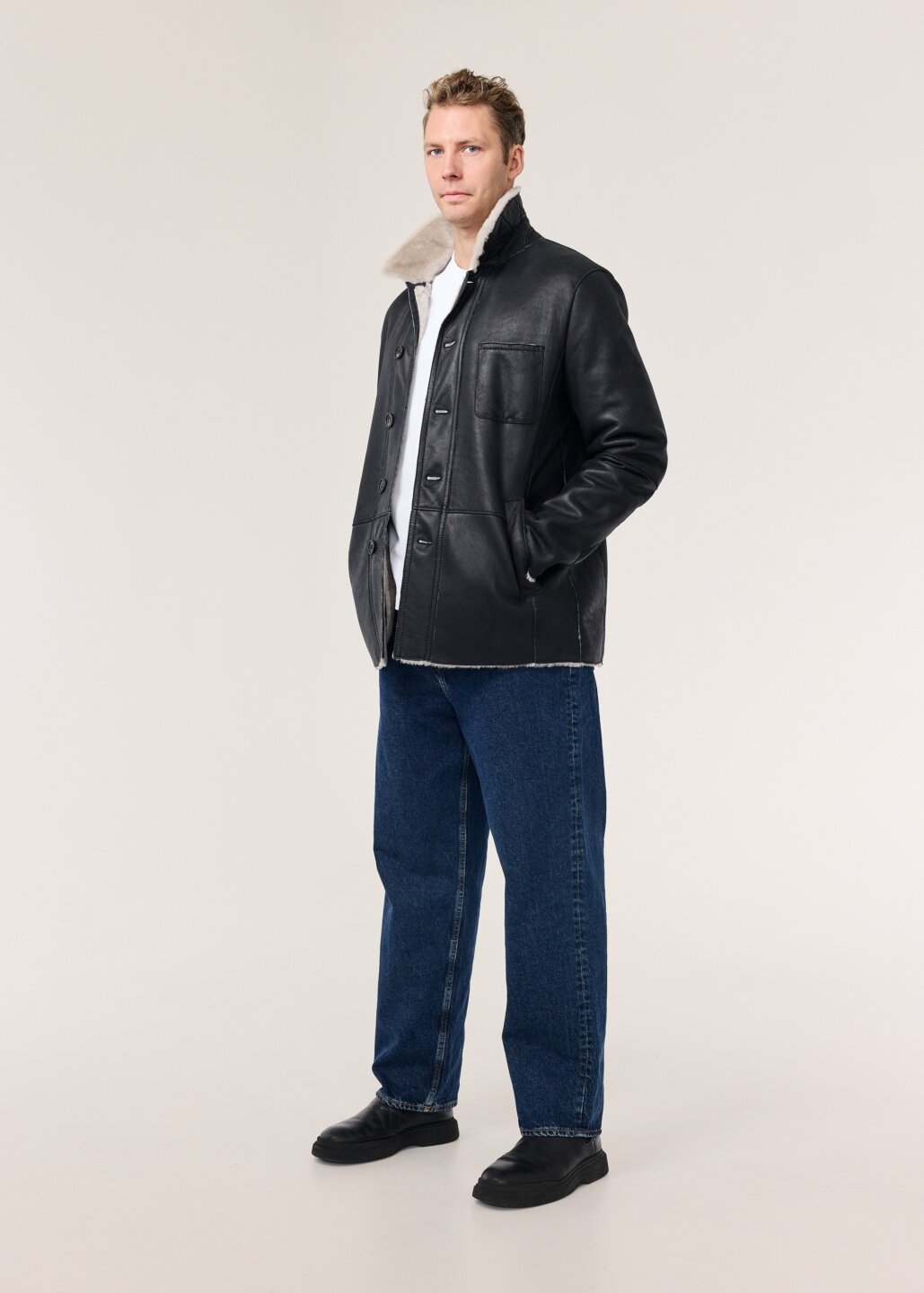 Logi er lipur og klassískur mokkajakki, framleiddur úr silkimjúku velúr lambaskinni. Jakkinn er ótrúlega léttur með hefðbundnu vinnujakka sniði. kraginn á jakkanum fellur fallega niður, en einnig er hægt að hneppa honum upp í háls á kaldari dögum. Jakkanum er hneppt með tölum framleiddum úr ekta horni, hann er prýddur þremur fallegum ytri vösum auk tveggja praktískra innri vasa. Þessi jakki er ómissandi í fataskápinn.